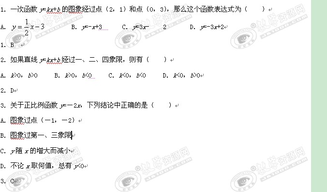 数学:《用函数观点看方程(组)与不等式》同步练习1(人教版八年级上)
