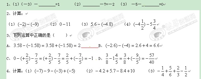数学: 1.3.2《有理数的减法》作业(人教版七年级上)