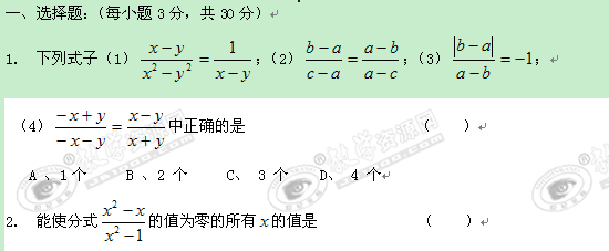 数学:11.1《分式》同步测试(北京课改版八年级上)