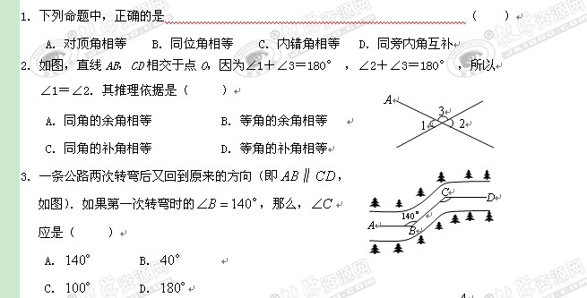 数学:第二章《平行线与相交线》单元检测(北师大版七年级下)