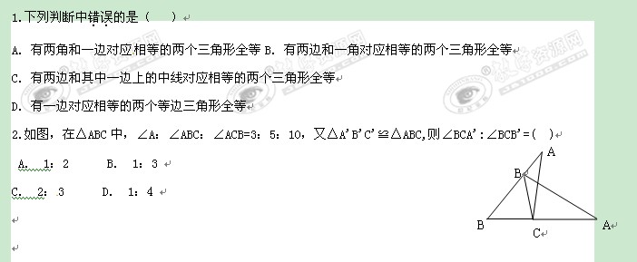 数学:湖南省洪江芙蓉中学《全等三角形》复习检测试题 (八年级)