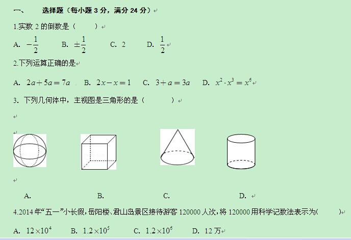 湖南省岳阳市2014年中考数学试题(word版,无答案)