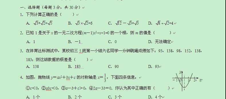 福建省龙海市第二中学2017届九年级上学期期中考试试题