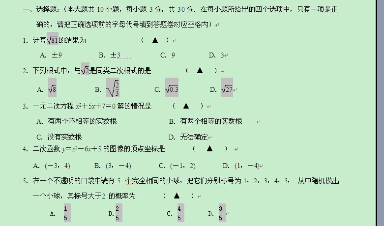 江苏省江阴石庄中学2013-2014学年度第一学期初三数学12月月考试卷