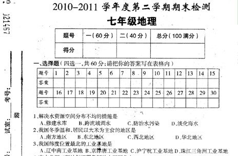 广东省罗定市10-11学年七年级下学期期末检测试题(地理)扫描版