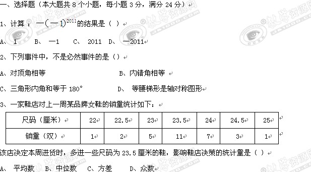 2011年湖南省张家界中考试卷(数学)