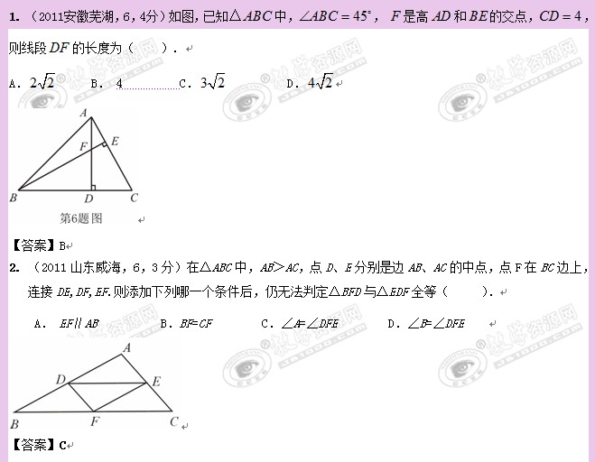 2009—2011年全国各地中考数学试卷分类汇编:全等三角形