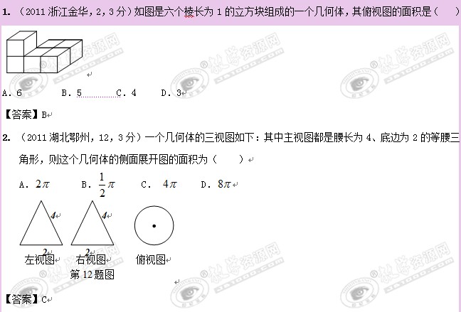 2009—2011年全国各地中考数学试卷分类汇编:投影与视图
