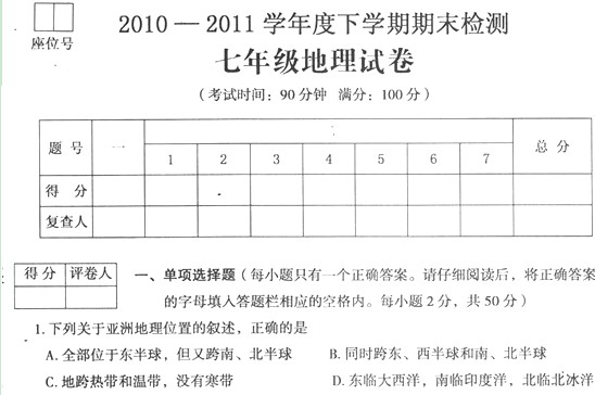 云南省宜良二中10-11学年七年级下学期期末考试试题(地理)扫描版