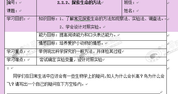 生物: 2.2.2《探索生命的方法》学案(苏教版七年级上)