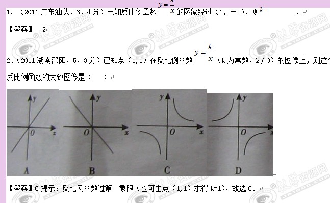 2011年全国各地中考数学试卷试题分类汇编三:反比例函数