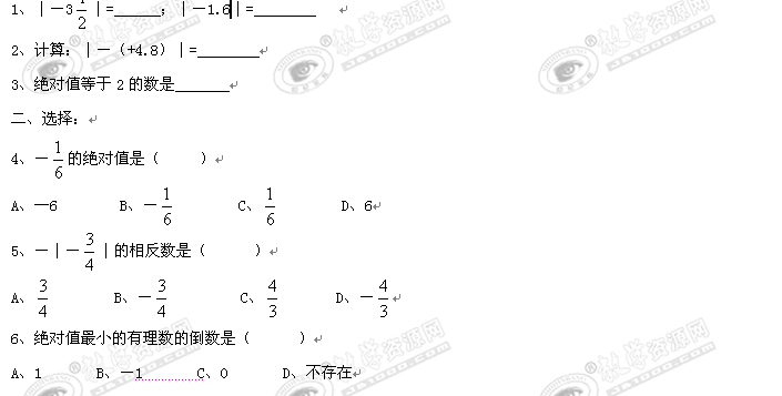 数学:1.4 《绝对值》同步练习(浙教版七年级上)