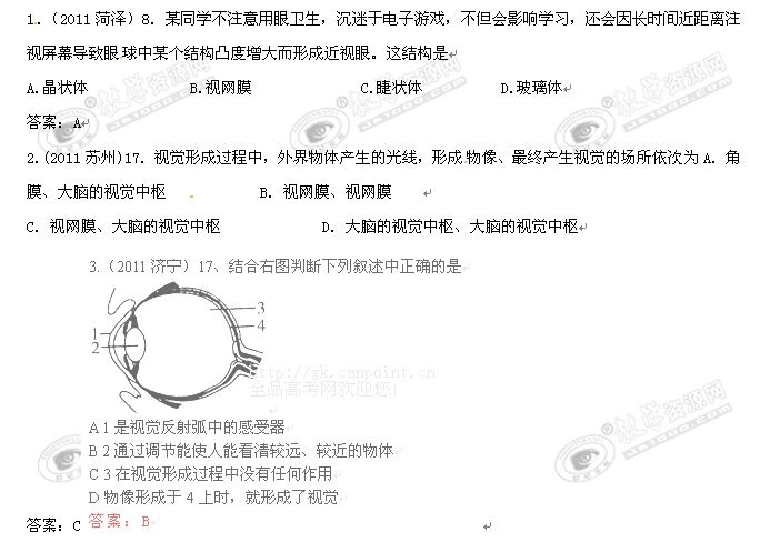 2011年全国各地中考生物试题分类汇编考点14:人体的感觉器官