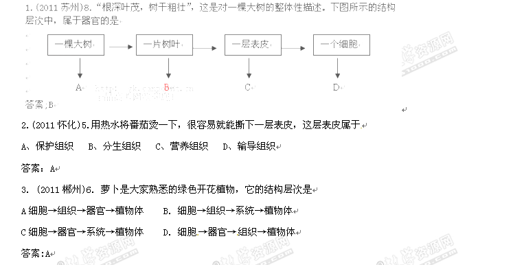 2011年全国各地中考生物试题分类汇编考点34:植物体的结构层次