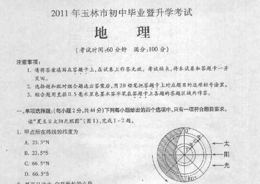 2011年广西玉林市、防城港市中考试题(地理)扫描版