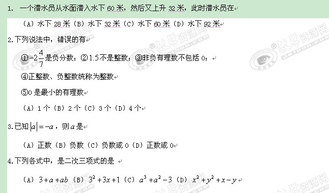 河北区11-12学年七年级上学期期中质量检测(数学)