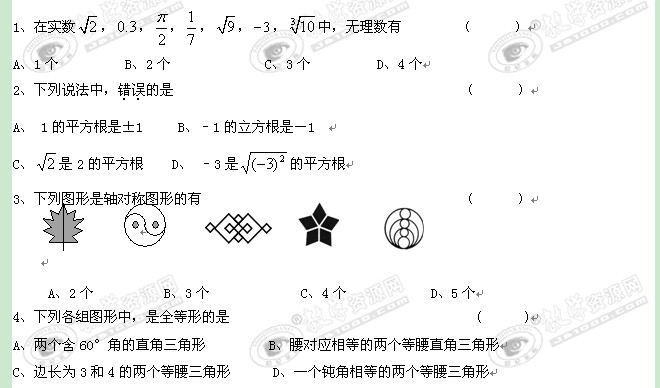 河南省信阳市二中11-12学年八年级上学期期中考试试卷(数学)缺答案