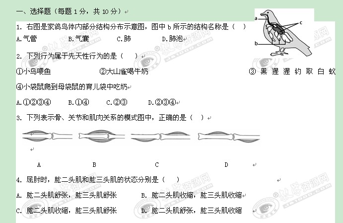 黄冈中学11-12学年八年级上学期期中试题(生物)缺答案