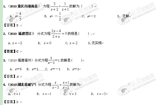 山东省枣庄市台儿庄区涧头二中2010年中考数学试题分类大全:分式方程