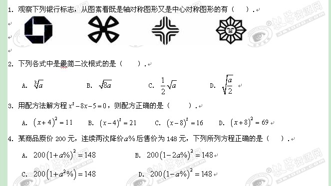 广东省汕头市植英中学11-12学年九年级上学期期中试题(数学)