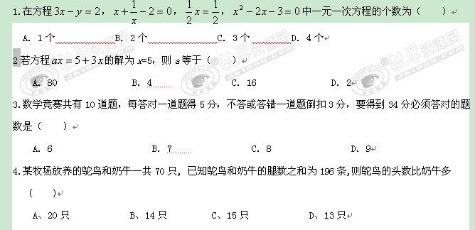 数学:《一元一次方程》知识测试题(1)(人教版七年级上)