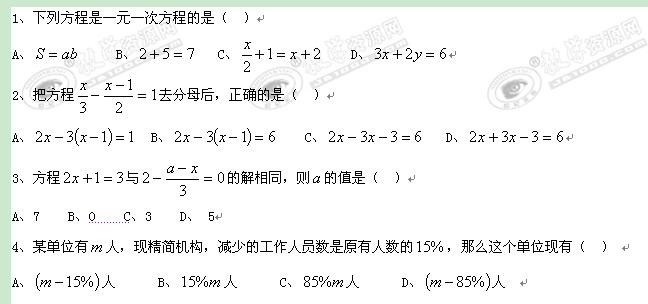 数学:《一元一次方程》知识测试题(5)(人教版七年级上)