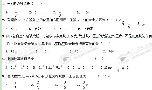 遵义市第十一中11-12学年七年级上期期末测试题(二)(数学)缺答案